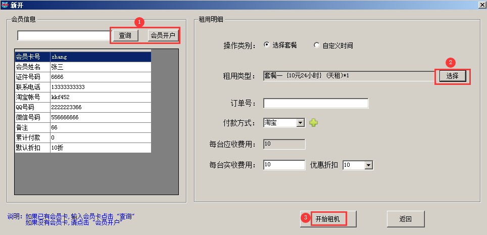 新客户选择 "会员开户"  ,已存在客户选择 "查询",  选择租用类型----开始租机