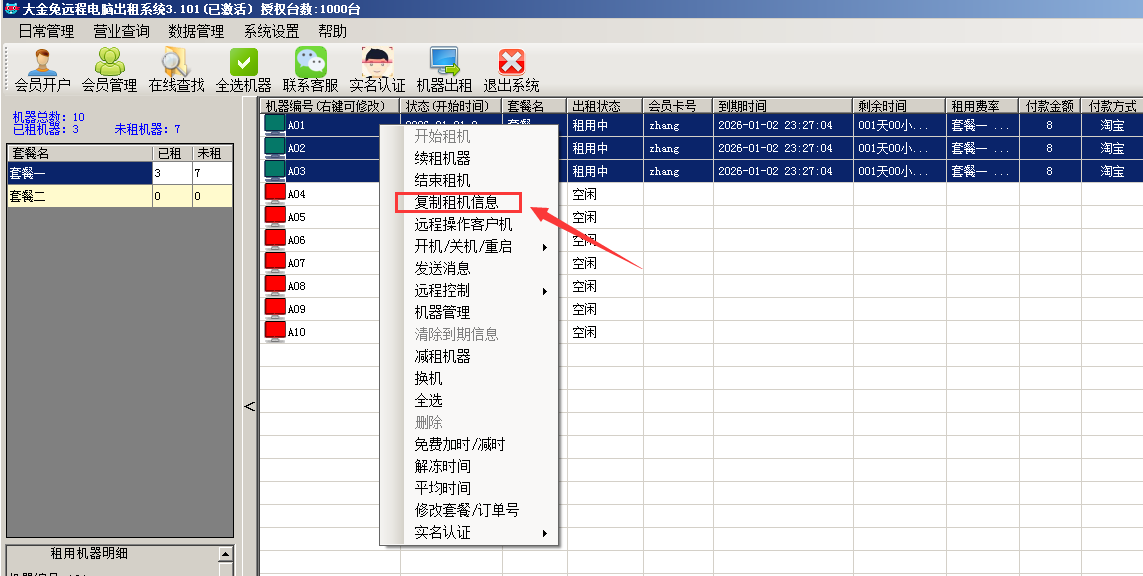 选择复制项目, 将租机信息发给客户,  客户用远程软件连接就可以使用了.